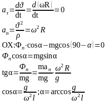 2. Конический маятник с длиной нити l, массой груза m, вращается вокруг оси с угловой скоростью ω. Определить зависимость угла наклона нити (α) от вертикали от постоянной угловой скорости.