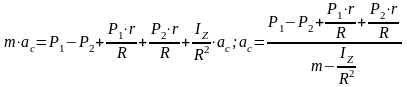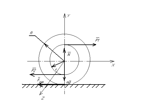 Пример . Катушка массой m, с радиусами r и R находится под действием двух горизонтальных сил P1 и P2. Определить ускорение центра масс катушки при качении ее без скольжения..