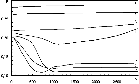Рис. 9. Зависимости коэффициента трения пары титан—стекло с различными граничными смазками от количества циклов трения: 1 — графитовый порошок в толуоле; 2 — графитовый порошок; 3 — без смазки; 4 — толуол; 5 — раствор фуллеренов в толуоле (0,72 мг/мл); 6 — раствор фуллеренов в толуоле (1,08 мг/мл); 7 — раствор фуллеренов в толуоле (2,15 мг/мл).