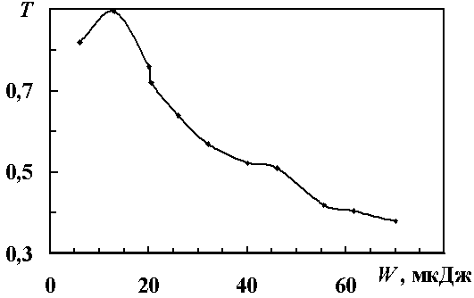 Рис. 8. Зависимость пропускания света С84-тетрагидронафталином на длине волны 1,064 мкм от вводимой энергии.