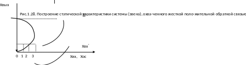 Рассмотрим статическую характеристику системы при положительной обратной связи (ПОС). На рис.1.28 показано построение статической характеристики системы при ПОС. Характеристики охватываемого I звена и звена обратной связи II рисуются в одном (первом) квадранте. Для ПОС уравнение сумматора Хвх = Хвх′ + Хос, или Хвх′ = Хвх – Хос. Отсюда почти аналогичное, как и при отрицательной обратной связи, и построение характеристики: точка 2 результирующей характеристики определяется как разность отрезков (0 – 3) минус (0 –1) и т. д.