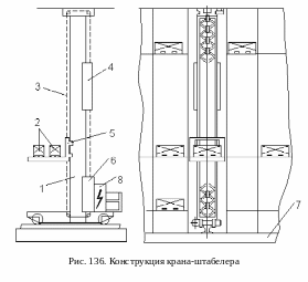 В качестве примера рассмотрим конструкцию и особенности крана-штабелера, используемого в автоматизированных стеллажных складах шинной промышленности (рис. 136).