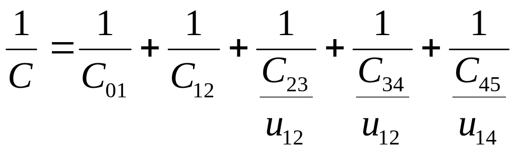 Рассмотрим влияние на динамику машины упругости. Наиболее важной характеристикой привода, отражающей это влияние, является его жесткость. Покажем, каким образом может быть определена жесткость привода на примере цилиндрического редуктора. Здесь 0 - двигатель, 1,2,3,4 - зубчатые колеса, 5 - ведомое звено (рис.3.44). С01, С12, …С45 - жесткости валов и зубчатых передач. Под жесткостью вала понимается его жесткость на кручение.