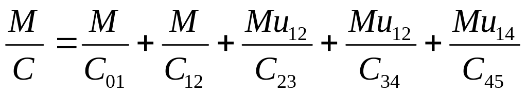 Пусть к выходному звену (валу) механизма приложен момент М, а ведомое звено 5 остается неподвижным. При этом из-за податливости всех промежуточных элементов входной вал повернется на некоторый угол . Отношение С = N/ называется жесткостью передаточного механизма. Последовательно определяя угловые деформации каждого из упругих элементов механизма и привода эти деформации к входному валу, подучим