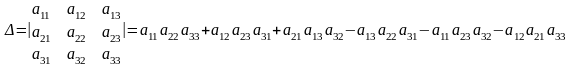 Этот способ вычисления носит название «метод треугольников Саррюса» и подчиняется следующему правилу: первые три слагаемых со знаком (+) это произведения элементов, стоящих на главной диагонали и в вершинах треугольников с основаниями, параллельными главной диагонали Следующие три слагаемых со знаком (-) это произведения элементов на побочной диагонали и элементов, стоящих в вершинах треугольников, с основаниями, параллельными побочной диагонали.