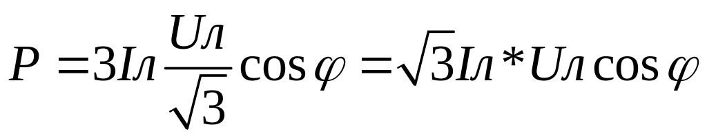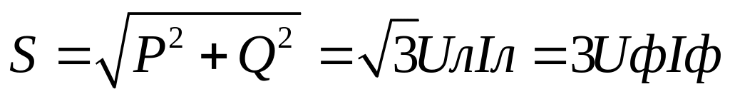 Активная мощность 3-фазной цепи при симметр. нагрузке = сумме актив. мощностей: Р = РА+Рв+Рс. Реактивная мощность аналогична: Q = QA+Qв+Qс. Т.к. система симметрична, мощности равны м/у собой: РА=Рв=Рс=Pф => Р = 3*Рф