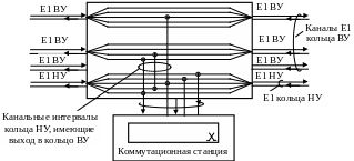 2) количество потоков Е1 в кольце ВУ практически не ограничивается (ограничивается количество Е1, входящих (выходящих) в мостовые станции (см. рис. 5);