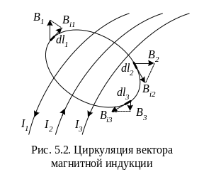 Рассмотрим понятие о циркуляции по рис. 5.2. В каждой точке произвольного замкнутого контура вектор магнитной индукции В может иметь любое направление. Проекцию этого вектора на направление элемента dl около выбранной точки контура обозначим Вi. Тогда циркуляция вектора магнитной индукции определится выраженим