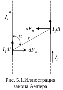 Опытом установлено, что на каждый из двух проводов действуют силы, притягивающие провода с одинаковым направлением токов и отталкивающие их если направление токов противоположно (рис. 5.1). Количественная оценка силы взаимодействия определена законом Ампера, согласно которому сила взаимодействия между двумя элементами тока в вакууме пропорциональна произведению элементов тока и обратно пропорциональна квадрату расстояния между ними.