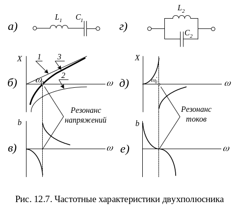 Зависимости и изображены соответственно на рис. 12.7, д и е. При реактивная проводимость b становится равной нулю, а реактивное сопротивление Х претерпевает разрыв от + ∞ до - ∞. При в двухполюснике рис. 12.7, г имеет место резонанс токов.