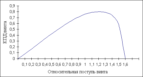 Теперь о том, что такое правильно подобранный винт. Вернемся к графику КПД. Если на нем нанести семейство графиков винтов, различающихся только шагом, то они будут напоминать имеющийся, но сжатый, либо растянутый по оси , как это упоминалось выше. Правда максимум КПД при уменьшении шага тоже уменьшается. Значение максимума 0,8 имеет место в случае, если оптимальное скольжение винта попадает на относительную поступь величиною около единицы. Это и есть один из критериев правильно подобранного винта.