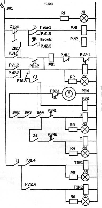 Работа линии контролируется лампами Л1…Л6. При срабатывании автоматических выключателей ВА2, ВА3 или ВА4 отключаются не только соответствующие силовые цепи, но и соответствующие цепи схемы управления с тем, чтобы отключить приводы двигателей, подающих перерабатываемый продукт на отключившийся механизм. Для этого используются замыкающие вспомогательные контакты автоматических выключателя ВА2, ВА3, ВА4 в схеме управления.