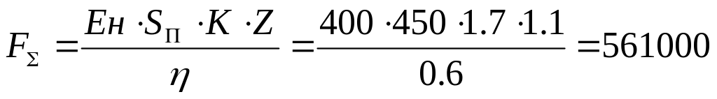 де Ен – нормована освітленість, лк; Sп – площа освітлювального приміщення, м2; Kз – коефіцієнт запасу, що враховує зниження освітленості внаслідок забруднення та старіння ламп (для ЛР – Kз=1,3÷1,5; для ГРЛ – Kз=1,5÷1,2);