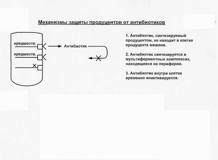 комплексы (за счет водородных связей), в которые «входят»предшественники антибиотика, а «выходит» целая молекула антибиотика (вовнешнюю среду). Эти комплексы располагаются по периферии клеткипродуцента. Таким образом, антибиотики отделяются от других систем