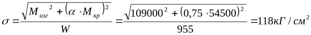 где α — коэффициент приведения, учитывающий отношение допускаемого напряжения на изгиб, соответствующего режиму изгибающих нагрузок, к допускаемому напряжению на изгиб, соответствующему режиму крутящих нагрузок; α = 0,75; W — экваториальный момент сопротивления поперечного сечения барабана;