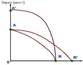 При одностороннем расширении производства зерна кривая АЖ смещается до положения А1Ж, при увеличении производства ракет — до положения АЖ1. Кривая производственных возможностей может быть использована для характеристики структурных сдвигов между промышленностью и сельским хозяйством, общественными и частными благами, текущим и будущим потреблением (потребительскими и инвестиционными товарами и услугами) и т.д.