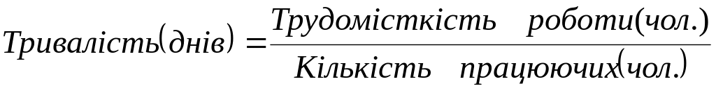 Тривалість роботи залежить від сумарної трудомісткості кожного елементу роботи, і числа працюючих, які можуть її виконати; часу очікування постачання деяких ресурсів (матеріалів, обладнання тощо, яке не залежить від числа робітників, що виконують роботу. (формула 8.1).