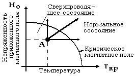 Зависимость критического поля от температуры по сути представляет собой фазовую диаграмму сверхпроводника. Металл будет находиться в сверхпроводящем состоянии при любой комбинации температуры и приложенного магнитного поля, например точку А.