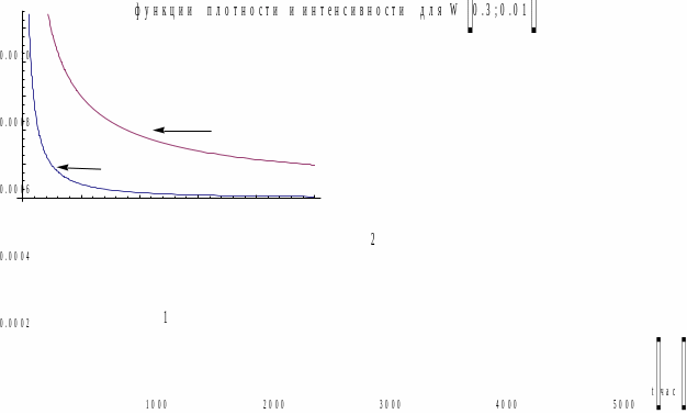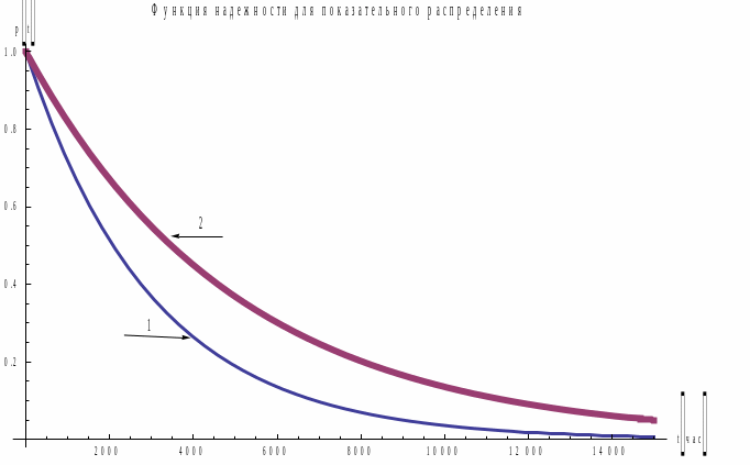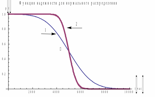 Рис 2. Графики p(t) для 1) N(5000 час, 1500 час) и 2) N(5000 час, 500 час).