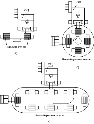 С целью увеличения времени автономной работы ГПМ их оснащают многоместными транспортно - накопительными устройствами(рис.7.3.). В простейшем варианте ГПМ может иметь два рабочих стола (рис.7.3,а).