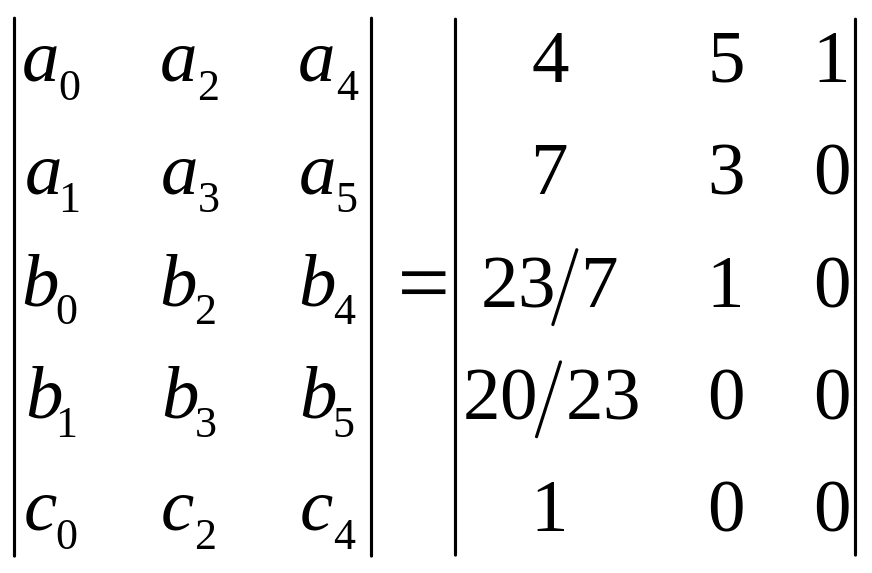 b0=5-43/7=23/7; b2=1-40/7=1; b1=3-71/23/7=20/23; b3= 0-049/23=0; C0 =1- 023/7 / 20/23=1