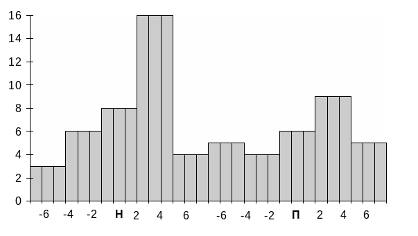 Рис.14. Выявление ритма синодического лунного месяца в результатах измерений гравитационной постоянной с 4.12.90 по 27.08.91 методом наложенных эпох. По горизонтальной оси - отклонение в сутках от новолуния Н или полнолуния П, по вертикальной оси - число измерений с очень низкими значениями гравитационной постоянной (G<6,670.10-11 м3кг-1с-2).