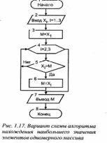 Использование массивов позволяет осуществить дальнейшее упрощение алгоритма поиска наибольшего (наименьшего) значения в последовательности чисел, избавляясь от сложной разветвляющейся структуры и переходя к алгоритмам более простой циклической структуры. Для этого исходные простые переменные а, Ь, с, ... представим в виде элементов одномерного массива, например X, то есть: Х,=а, Х2=6, Х3=с, ... После такой замены, используя простейший детерминированный цикл с переменной цикла, отслеживающей изменение индексов массива X, получаем сравнительно простой алгоритм поиска наибольшего значения в последовательности чисел (рис. 1.17). Отметим, что в подобном алгоритме количество блоков остается без изменений при любом увеличении количества исходных переменных а, Ь,с,..., изменяется только размер массива X, то есть количество его элементов X,, Х2, Х3,...