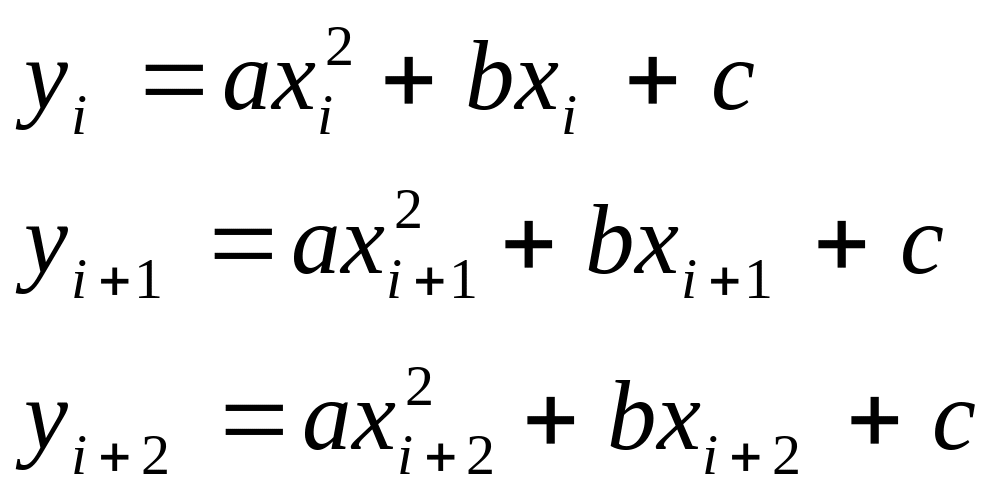 Квадратичная интерполяция (y = ax2 + bx + c) выполняется по 3-м точкам (xi, yi), (xi + 1, yi +1) и (xi + 2, yi +2) и получается система 3-х линейных уравнений: