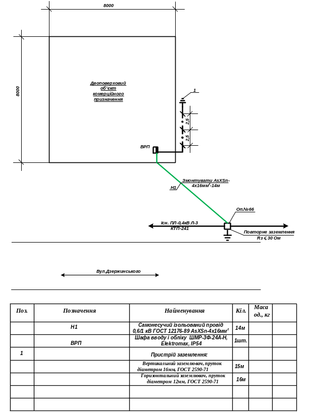 В цій частині проекту показуємо живлення об’єкту проектування від джерела живлення та вказуємо марку, кількість та переріз кабелю живлення або проводу, вказуємо заземлення розподільчих шаф, висоту будівлі, загальні розміри, назву. План зовнішнього електропостачання викреслюється на аркуші А4 пояснювальної записки у вибраному масштабі. Виконуємо специфікацію до плану зовнішнього електропостачання форми 7 додатка Ж ДСТУ Б А2.4-4. Наприклад, викреслюємо план зовнішнього електропостачання двоповерхового об’єкту комерційного призначення: