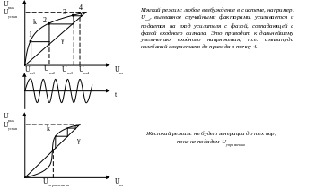 В пассивных цепях колебания затухают, поэтому для возникновения и поддержания незатухающих колебаний необходимо включение в цепь активных элементов. Т.е. в любом автогенераторе три схемы: колебательная система, активный прибор (транзистор и др.), источник питания постоянного тока. Для возникновения автоколебания необходимо ПОС и петлевое усиление, большее или равное 1 (kγ ≥ 1). Признак отсутствия устойчивого состояния – присутствие реактивных элементов. Установившиеся колебания уже будут при kγ = 1, где γ – глубина ОС, k – коэффициент усиления, не охваченного ОС. kγ – комплексная величина, потому это выражение разделяется: | kγ | = 1 – условие баланса амплитуд; arctg kγ = n 2π, где n = 0, 1, 2, …. В реальных цепях kγ > 1, поэтому амплитуда колебаний возрастает. При определенной амплитуде усилительный каскад выйдет на нелинейный участок, условие соблюдается. Существует два режима самовозбуждения – мягкий и жесткий.