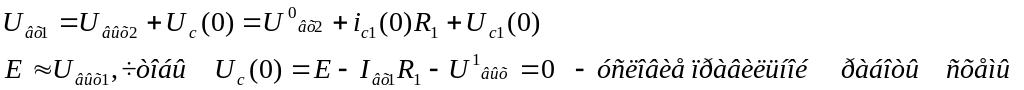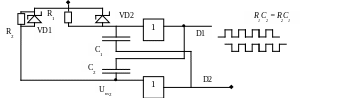 Имеет два состояния квазиравновесия. Одно – высокий потенциал Uвых1, второе – низкое. Длительность зависит от R1C2, а второго состояния – R2C1. Допустим, при включении питания схема оказалась в состоянии U1вых1, U0вых2. Напряжение на входе D1 будет определяться зарядом конденсатора С1 и потенциалом выхода D2.