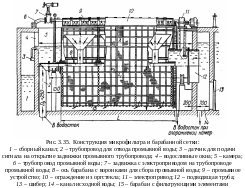 Барабанные сетки и микрофильтры (рис. 3.35) являются аппаратами непрерывного действия. Основная часть установки — барабан сварной конструкция, на поверхности которого смонтированы фильтрующие элементы. Барабан приводится во вращение приводом, состоящим из электродвигателя и редуктора. Осью вращения барабана служит труба, являющаяся одновременно коллектором для отвода промывной воды, которая собирается воронками, расположенными внутри барабана. Очищаемая вода поступает внутрь установки через открытую торцевую стенку барабана параллельно его оси и выходит радиально, фильтруясь через сетку. Обработанная вода из камеры установки через водослив подается и канал, отводящий воду на последующие сооружения. Примеси выделяются вследствие как механического процеживания их в сетчатом полотне, так и задержания их в слое образующегося на сетке осадка. Сетки промываются струями воды из пластинчатых разбрызгивателей, расположенных над сеткой. Основные технические данные барабанных сеток типа БС и микрофильтров МФ даны в приложении 18.