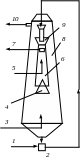На рис. 4.33 приведена схема аппарата непрерывного действия, выполненного в виде колонны со взвешенным слоем ионита. Колонна имеет форму усеченного конуса, внутри которого находится второй конус, где происходят процессы регенерации и отмывки ионита. Сточная вода подается в нижнюю часть колонны 8 при помощи распределительной системы. Пройдя через псевдоожиженный слой ионита, вода выводится из верхней части колоны по трубопроводу 10. Отработанный ионит осаждается в нижней части колонны, откуда забирается при помощи эрлифта или эжектора и по трубопроводу направляется в верхнюю часть колонны и подается во внутренний конус 6. Во внутреннем конусе для вовлечения в него ионита скорость движения воды уменьшается при помощи конического регулятора 4. Регенерирующий раствор подается в нижнюю часть внутреннего полого конуса, а отводится из верхней его части. Ионит, двигаясь во внутреннем конусе, сначала подвергается регенерации, а затем отмывке и переходит в рабочую зону колонны.