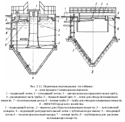 Различные типы вертикальных отстойников отличаются конструкцией впускных и выпускных устройств и соответственно производительностью. Наиболее распространенными являются отстойники с впуском воды через центральную трубу, снабженную в нижней части раструбом и отражательным щитом (рис. 3.11, а).