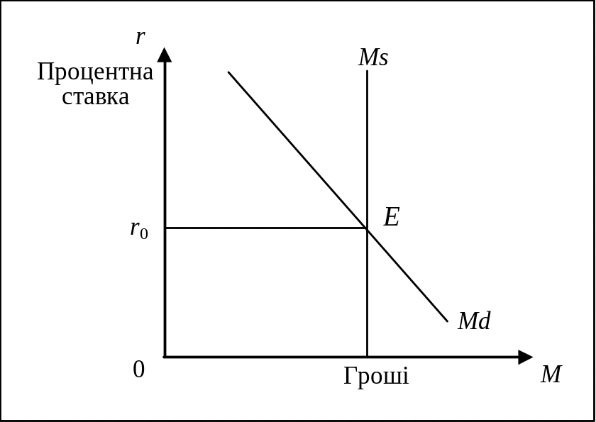 Перетин ліній Md i Ms у точці Е визначає не лише момент установлення рівноваги монетарного ринку, а й показник рівноважної норми процента (ro), яка в даному разі є похідною величиною. За будь-якої нижчої процентної ставки рівень попиту на гроші перевищуватиме їх кількісну пропозицію. І навпаки, за будь-якої вищої процентної ставки пропозиція грошей перевищує рівень попиту. Лише в точці Е пропозиція і попит збігаються (рівноважні).