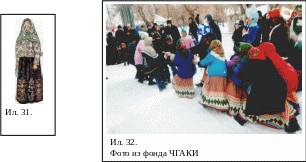 3.2.3. Костюм. Такой же самостоятельной единицей игровой сценографии в обрядовых действах был костюм, создающий образ целой Вселенной. В старину на Руси жених и невеста перед свадьбой одаривали друг друга деталями костюма, вещами, необходимыми в быту. Невеста одаривала рубахой, штанами своей работы, поясом или кушаком, вышитой ширинкой, полотенцем из лучшего холста. В некоторых регионах было в обычае дарить жениху ковер для свадебных санок, ковровую подпругу, гарусные вожжи, шерстяной платок. Подарки жениха состояли из верхней одежды, обуви, украшений, а также ларца с румянами, гребнем, зеркальцем. Обувь как подарок имела не только практическое значение, но являлась опять же символом привязанности будущей жены к дому.