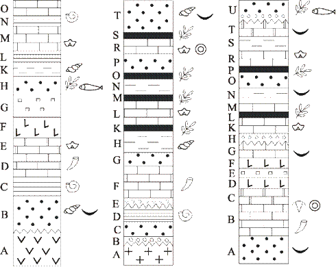 Серые илы, тонкие пески, углистые или битуминозные, мелкозернистые, горизонтальнослоистые, очень редко известняки, при заболачивании образуются прослои торфа или сапропеля |