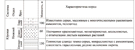 касимовский ярус. Известняки темно-серые мелкозернистые с брахиоподами, сланцы черные горючие; конкреции сидеритов. Мощность 130 м.