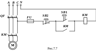 Разделяют силовую электрическую цепь (для подключения электродвигателя к трём фазам питающей сети) и электрическую цепь управления двигателем (которую включают, как правило, на фазное напряжение). Принципиальная электрическая схема управления асинхронным электродвигателем с короткозамкнутым ротором показана на рис.7.7.
