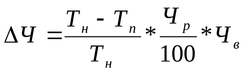 Оцінку впливу зниження трудомісткості продукції, поліпшення використання робочого часу, удосконалення структури кадрів на підприємстві можна визначити за допомогою таких формул: