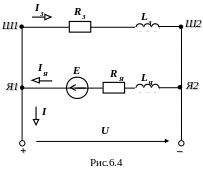 Дана характеристика показує, як змінюється напруга на затисках генератора при зміні сили струму навантаження, тобто зовнішня характеристика генератора – це залежність напруги на затисках (на щітках) генератора від сили струму, який протікає в обмотці якоря. Одержимо рівняння цієї характеристики на підставі розрахункової схеми генератора (рис.6.4), для чого складемо рівняння електричної рівноваги якірного кола та виразимо потенціал точки Я1 (Я1) через потенціал точки Я2 (Я2):