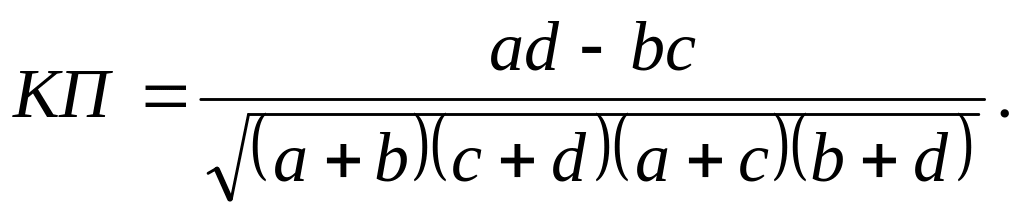Применяется к вариации двух качественных признаков, распределенных по двум группам. Расчет производится на основе таблиц и четырех полей. Формула расчета: