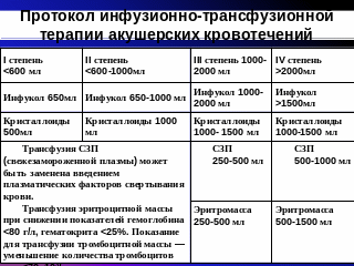 Основная задача первого этапа - остановить кровотечение не допустить большой кровопотери, не допустить дефицита возмещения кровопотери, сохранить объемное соотношение вводимой крови и кровезаменителей, равное 0,5-1,0, возмещение 100%.