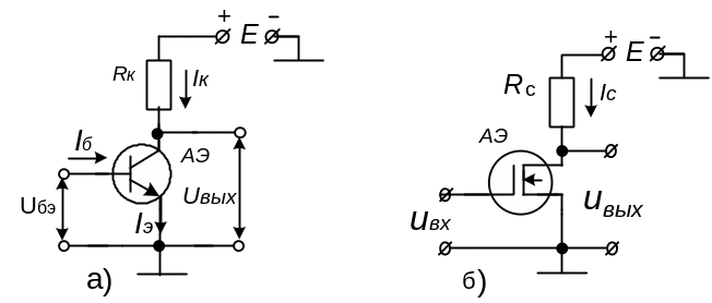 Принцип действия усилителя можно пояснить с помощью схем простейших усилительных каскадов, приведённых на рис. 3.1. Основой усилителя являются два элемента: сопротивление Rк (или Rc) и активный элемент АЭ (например, биполярный транзистор рис 3.1,а или полевой транзистор рис 3.1,б).