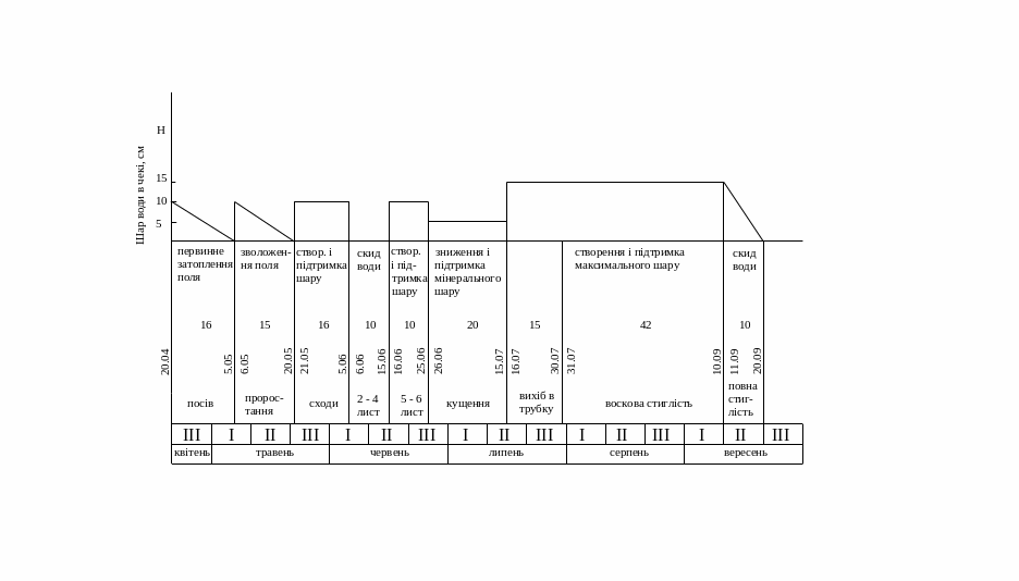 Сьомий етап передбачає створення і підтримку максимального 15см шару води на чекі протягом 15 діб (рис.1). Для створення такого шару додатково потрібно 1000м3/га (гр. 10), але за цей час витрати: 200+708+700-250=1358м3/га. Мп=100+1358=2358 або 2350м3/га.