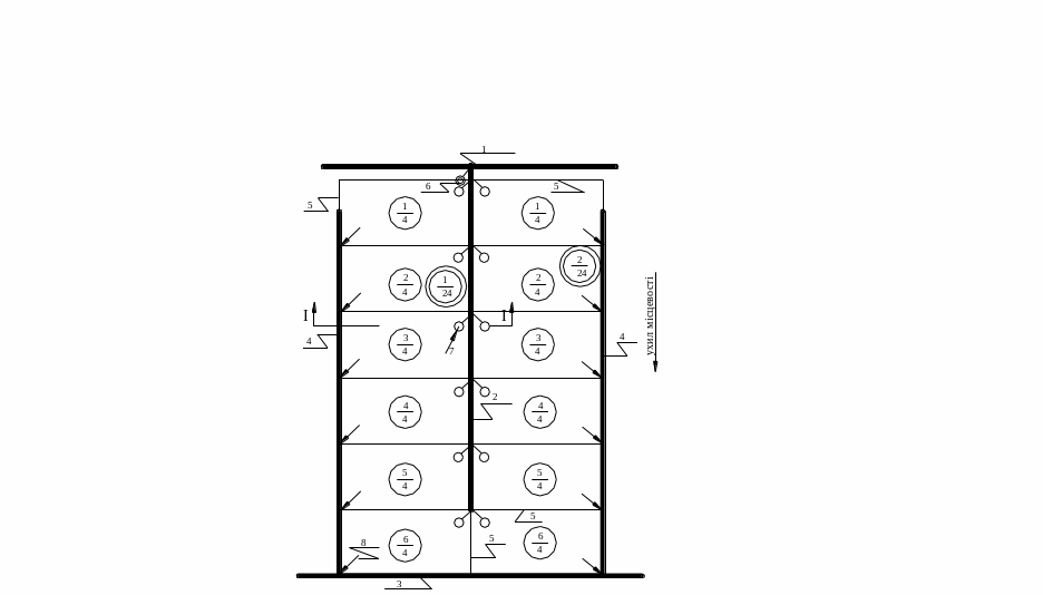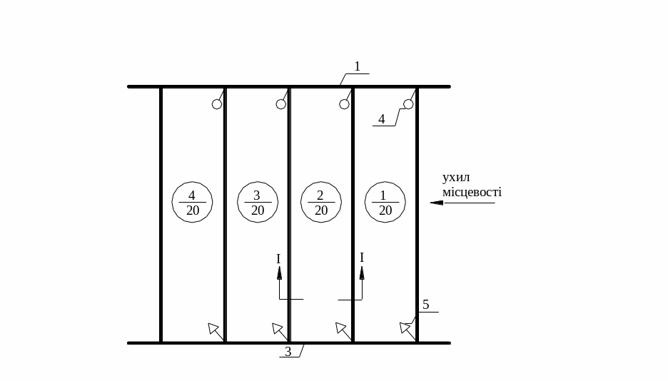 1 – дільничий розподільчий канал; 2 – зрошувач-скид; 3 – дільничий скид; 4 – водовипуск з розподільника в зрошувач; 5 – підпірні споруди в кінці скиду