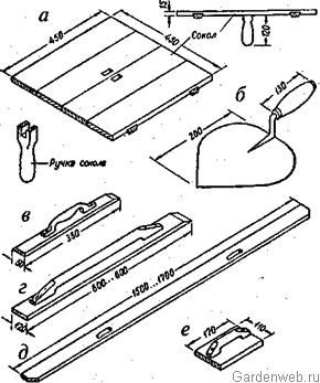Рис. 12. Инструменты для штукатурных работ: а — сокол, б — кельма, в — короткая полутерка, г — длинная полутерка, д — правило, е — терка