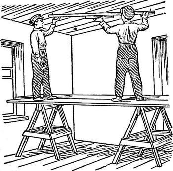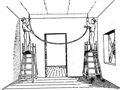 Рис. 10. Провешивание потолков при помощи уровня и правила