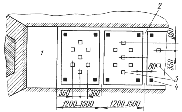 Рис. 16. Приклеивание гипсокартонных листов: 1 — гипсокартонный лист, 2 — полосы из мастики, 3 — марки из мастики, 4 — контрольные маяки.