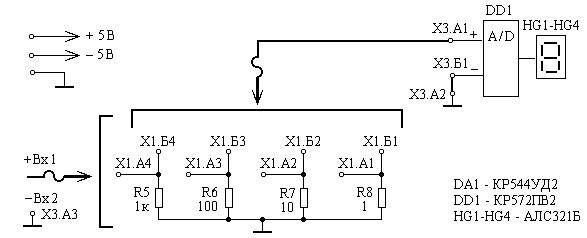 Резистори R1 і R2 служать для установки нуля підсилювача DА1: R2 - для грубої, R1 - для точної. Конденсатор С1 - блокувальний, підстроювальний резистор R8 служить для точної установки коефіцієнта передачі перетворювача змінної напруги у постійну.
